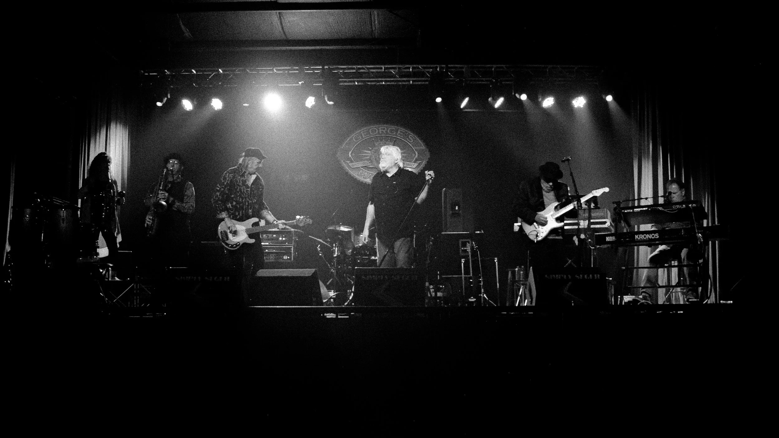 Rear view of a huge crowd of people dancing at the party in dark place lit by bright spotlight